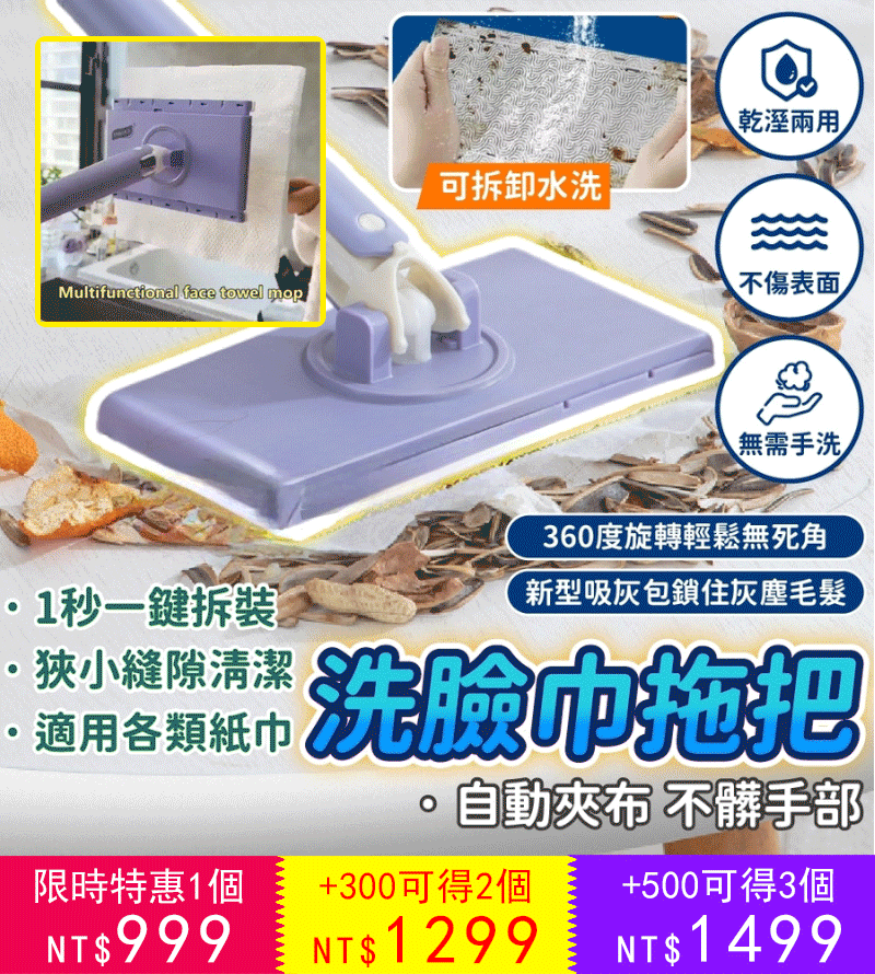 2分鐘前免手洗懒人伸縮拖把,新升級設計,不在擔心拖把不好弄,新升級長度設計,同時不沾手放人工擰拖把,使打掃變得簡單 - 【今日限定 買三送三 6把+ 拖布*6包 】-NT$1499